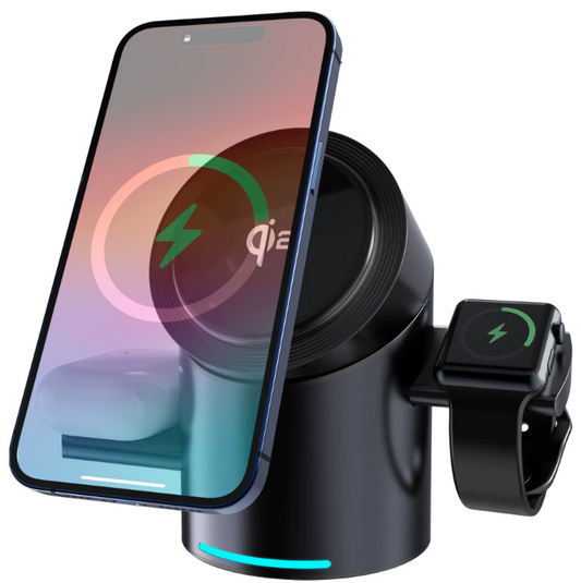 Orbit-Charge — Station 3-en-1 Qi2 auto-rotative pour smartphone, montre & écouteurs ⚡🔄📱⌚️🎧