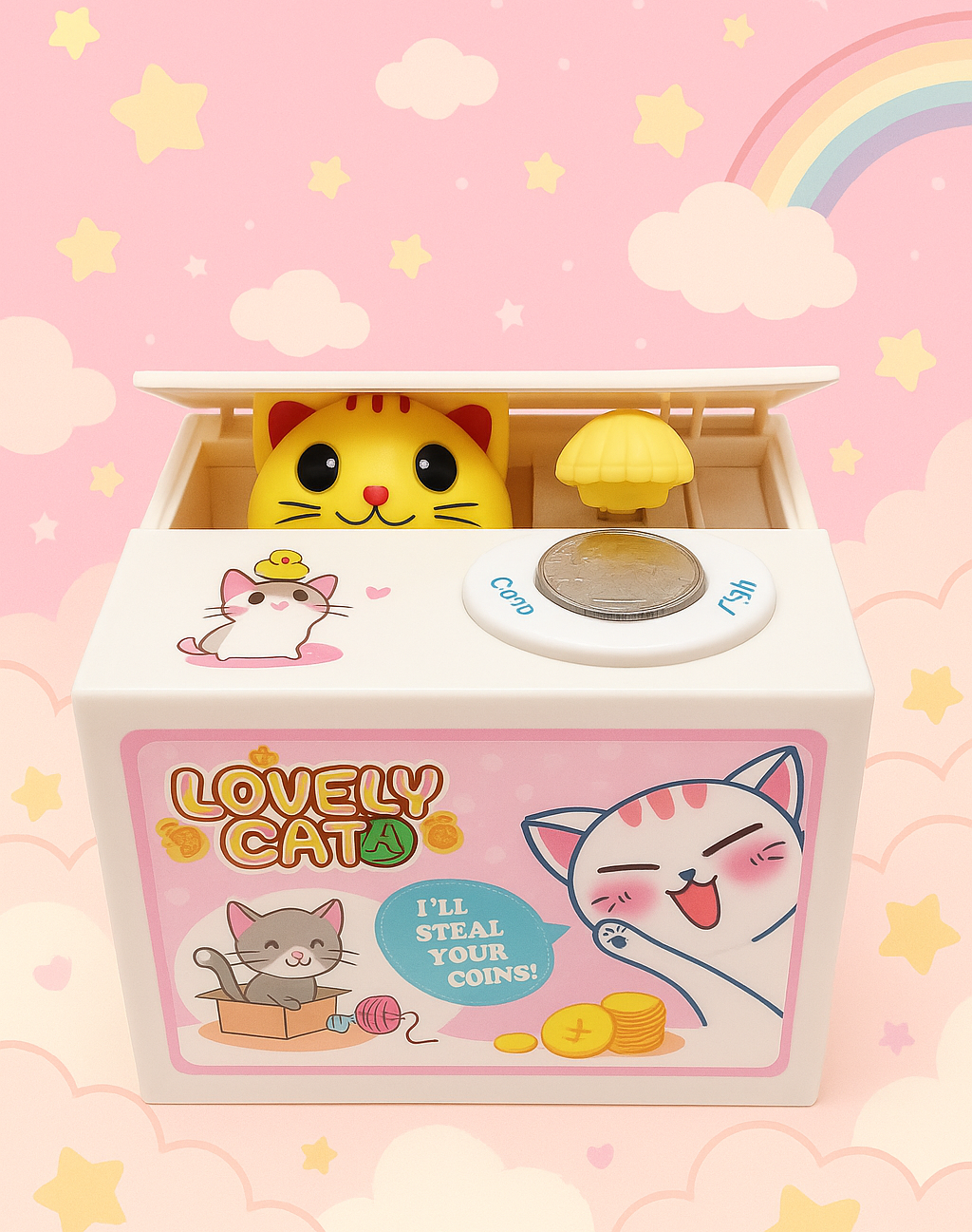 Déposez une pièce et un petit chat surgit en ~1 s pour la “voler” et la ranger dans la boîte !