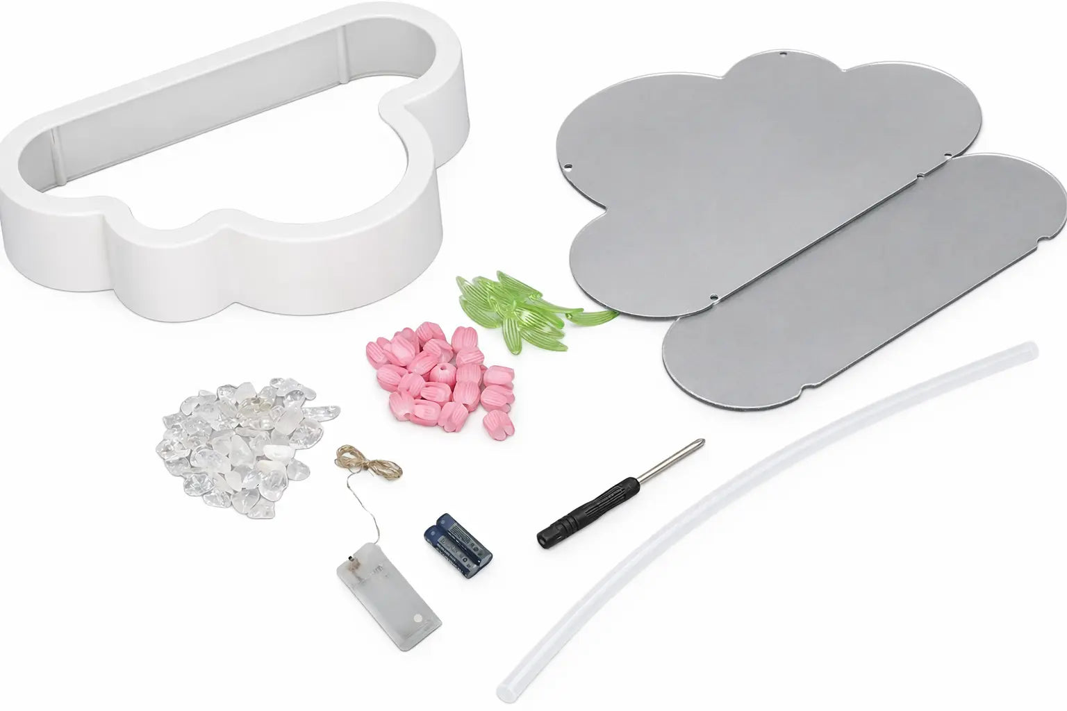 Guirlande LED, boîtier à piles, tulipes & feuilles décoratives et pince : tout est prêt pour une installation simple.